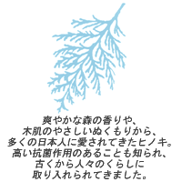 爽やかな森の香りや,木肌のやさしいぬくもりから,多くの日本人に愛されてきたヒノキ