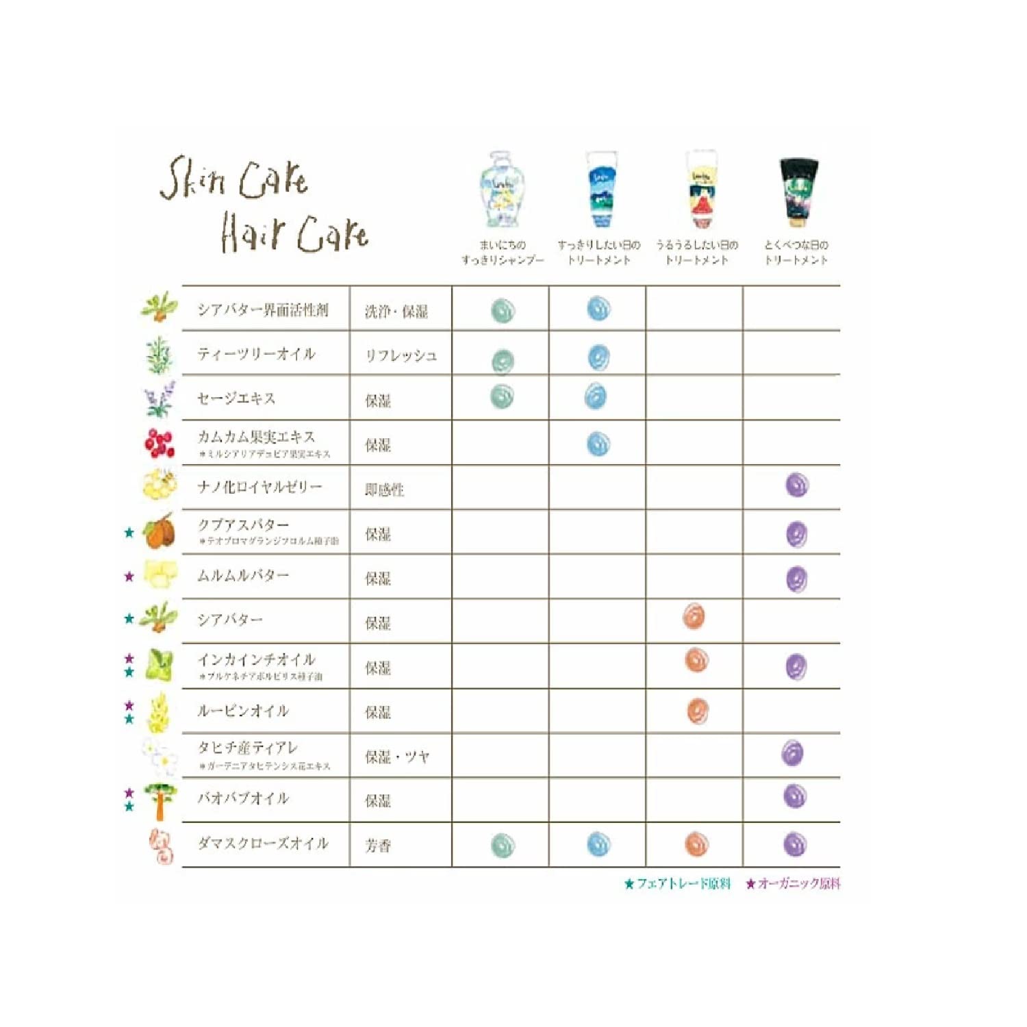 ■商品について■ 楽天スーパーロジスティクス対応商品です! 自分らしさにこだわりを持つ女性とプロの視点から生まれたシリーズ。 パッケージデザイン・香り・天然素材の全てが女性を元気にさせ、 素髪を活かしたべたつかない自然な仕上がりを表現。 【うるうるしたい日のトリートメント】(ヘアケア) シアバターの保湿成分で頭皮を健やかに保ちつつ天然のインカインチオイル、 ルーピンオイルで毛先までとぅるんと艶めく...