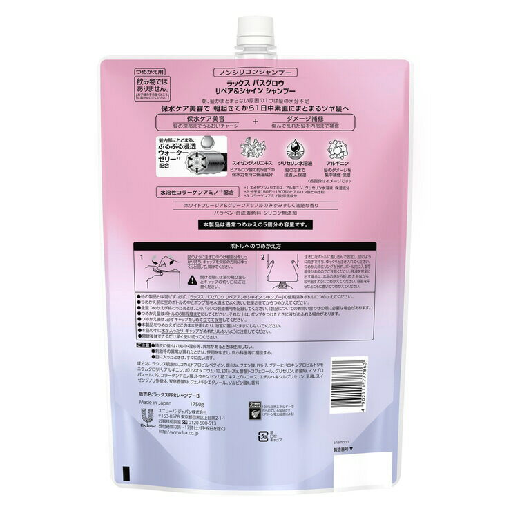 商品情報内容量1.75kgつめかえ5個商品タイプシャンプー原材料・成分水、ラウレス硫酸Na、コカミドプロピルベタイン、塩化Na、クエン酸、PPG-7、グアーヒドロキシプロピルトリモニウムクロリド、アルギニン、ポリクオタニウム-10、EDTA-2Na、酢酸トコフェロール、グリセリン、酢酸Na、イソプロパノール、PG、コラーゲンアミノ酸、トウキンセンカ花エキス、グルコース、エチルヘキシルグリセリン、乳...