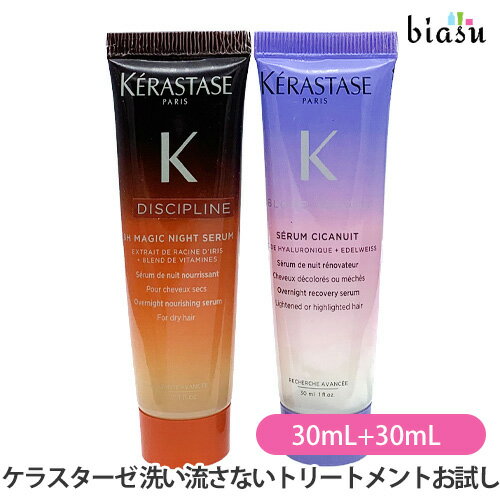 biasu【特記説明】こちらの商品は、未使用品ですが、デッドストック品のため、箱破れや汚れ等がある場合がございます。商品不良での返品・交換には応じられませんので、ご了承の上ご注文下さいませ。【商品名】 ケラスターゼ 洗い流さないトリートメントお試しセット(DP オレオリラックス マジックナイトセラム 30mL+BL ブロンドアブソリュセラム シカニュイ 30mL)【内容量】 マジックナイトセラム ...