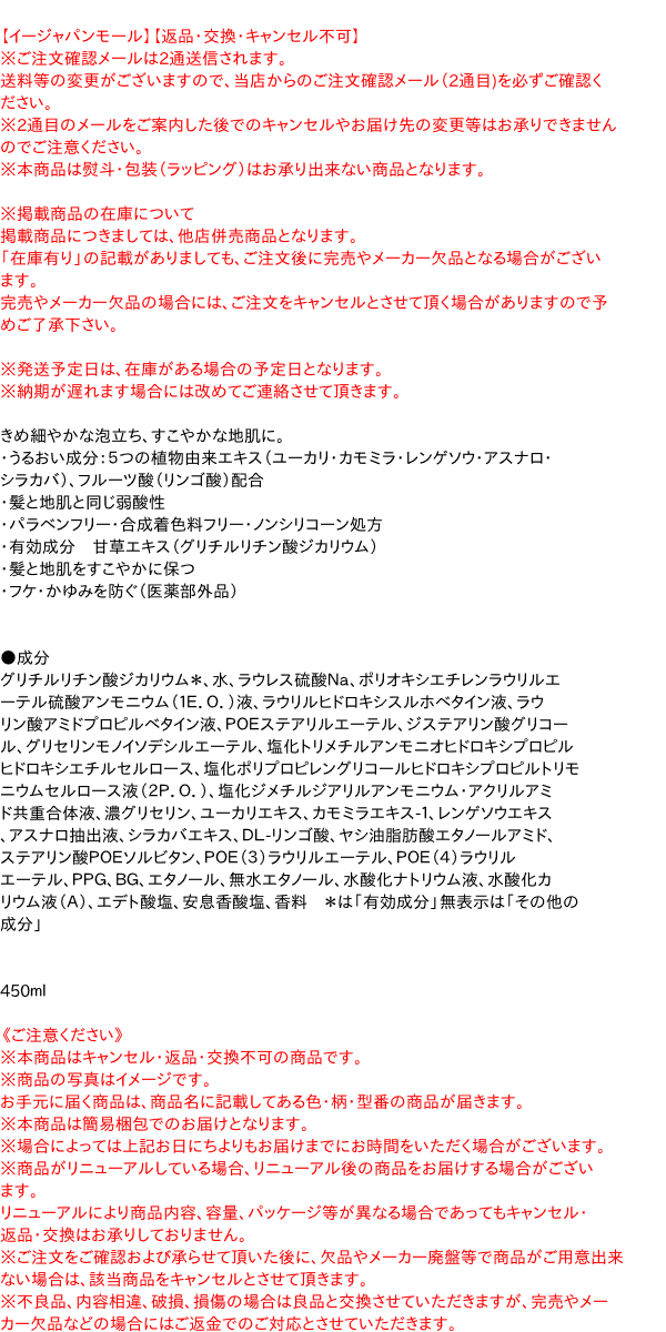 きめ細やかな泡立ち、すこやかな地肌に。・うるおい成分:5つの植物由来エキス(ユーカリ・カモミラ・レンゲソウ・アスナロ・シラカバ)、...