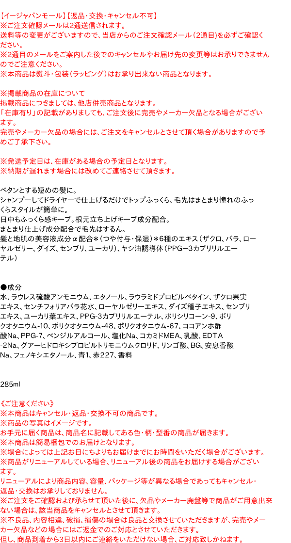 商品特徴 ●ペタンとする短い髪に。 ●髪を根元から立ち上げる「ふっくらスタイリング成分*1」配合。ドライヤーで乾かすうちに、トップふっくらボリュームアップ。時間がたっても、ふっくら続く。 ●シャンプー1本でご使用ください。 ●髪と地肌の美容液成分α配合(つや付与・保湿)。6つの天然由来成分*2と美髪成分*3。 ●気品あるアロマティックフローラルの香り。 *1 ポリシリコーン-9 *2 ザクロ・バラ...