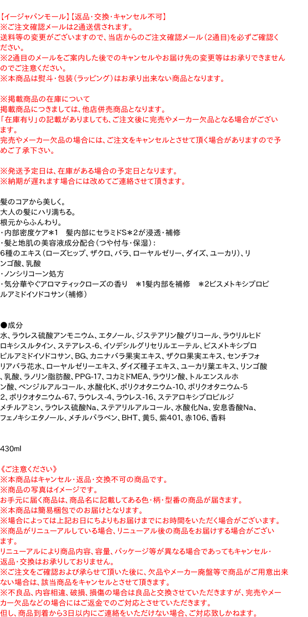 ※ご注意ください!!ご注文いただいてからのお取り寄せとなります。 ●商品の改訂により商品のデザイン、パッケージに記載されている内容と異なる場合があります。 【商品の特徴】髪のコアから美しく。大人の髪にハリ満ちる。根元からふんわり。●内部密度ケア*1髪内部にセラミドS*2が浸透・補修●髪と地肌の美容液成分配合(つや付与・保湿):6種のエキス(ローズヒップ、ザクロ、バラ、ローヤルゼリー、ダイズ、ユーカ...