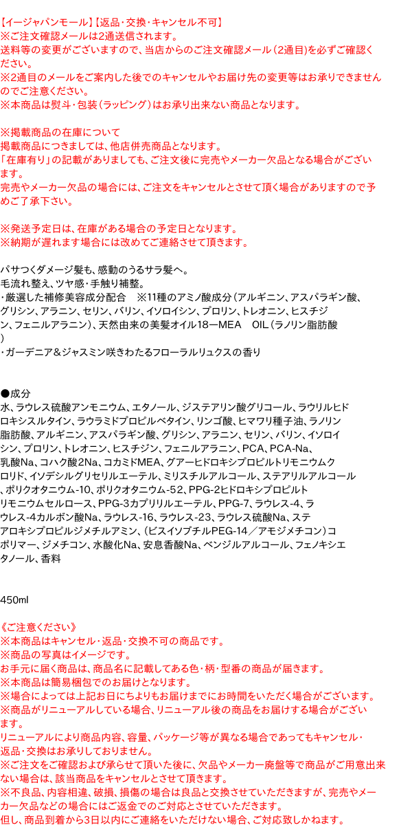 [特長]:■からまりやすく、整えにくい髪に。毎日洗うたび、傷んだ髪も思いどおり。翌朝も手ぐしでするん!毛先までふんわりうるツヤ髪へ。 ■キューティクルケア&髪内部まで浸透&補修 ■高純度ハニー&プロテイン※1配合※1ハチミツ、加水分解コラーゲン(保湿) ■天然由来の美髪オイル18-MEA OIL※2配合※2ラノリン脂肪酸(補修)■摘みたての花果実ふわり広がるフローラルブーケの香り[注意事項]:■頭...
