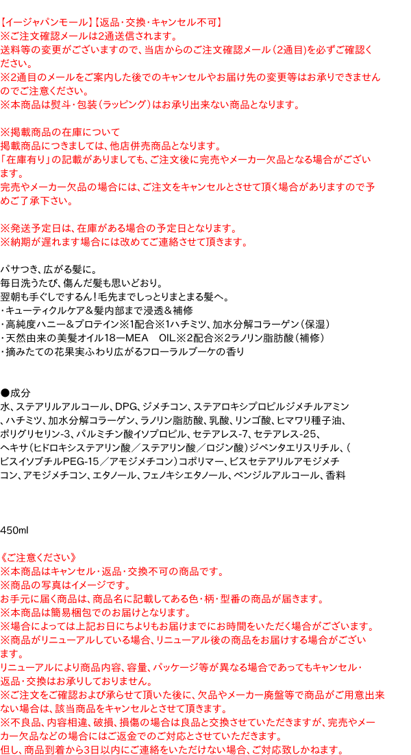 商品説明パサつき、広がる髪に。毎日洗うたび、傷んだ髪も思いどおり。翌朝も手ぐしでするん!毛先までしっとりまとまる髪へ。●キューティクルケア&髪内部まで浸透&補修。●高純度ハニー&プロテイン※1配合※1ハチミツ、加水分解コラーゲン(保湿)。●天然由来の美髪オイル18ーMEA OIL※2配合※2ラノリン脂肪酸(補修)。●摘みたての花果実ふわり広がるフローラルブーケの香り■製造元花王株式会社■ブランド名...