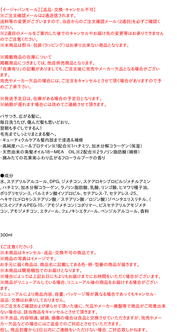 ■製品特徴美髪のベースメイク処方。毛流れを整え、ツヤ感や手触りを補整するシャンプー&コンディショナー。感動のうるサラ髪へ。●11種のアミノ酸成分配合(補修:アルギニン、アスパラギン酸、グリシン、アラニン、セリン、バリン、イソロイシン、プロリン、トレオニン、ヒスチジン、フェニルアラニン)●天然由来の美髪オイル18ーMEA OIL配合(毛髪保護:ラノリン脂肪酸)●フローラルリュクスの香り■内容量340...