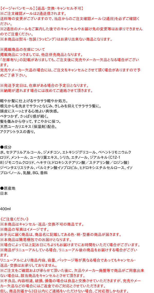 ※商品リニューアル等によりパッケージデザイン及び容量は予告なく変更されることがあります ★ 軽やか髪に仕上げるサラサラ軽やか処方 ★ 根元から毛先までサラッとなじみ、きしみを抑えてサラサラ髪に ★ 頭皮にスーッとする心地よい爽快感 ベタつかず、さっぱり感が続く。 ★ 髪を傷みから守って、すこやかに保つ ★ 天然ユーカリエキス(保湿剤)配合 ★ アクアシトラスの香り 成分 水、セテアリルアルコール、...