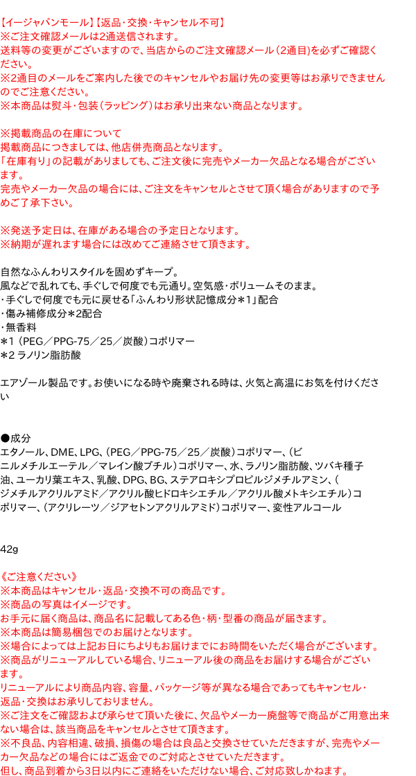 【商品説明】 立体感・空気感・束感ニュアンスどんなアレンジもテクニックいらず! 簡単にクセづき、髪も手もベタつき感ゼロ! ●しっかりクセづくのに髪も手もベタつかないフリーアレンジ成分*配合 ●無香料 *(PEG/PPG-75/25/炭酸)コポリマー エアゾール製品です。お使いになる時や廃棄される時は、火気と高温にお気を付けください。 成分 エタノール、DME、LPG、(PEG/PPG-75/25/...