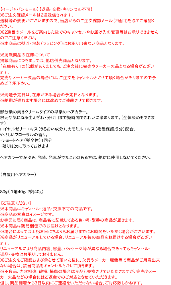 部分染め向きクリームタイプの早染めヘアカラー。根元や気になる生えぎわ・分け目まで短時間できれいに染まります。(全体染めもできます)ロイヤルゼ...