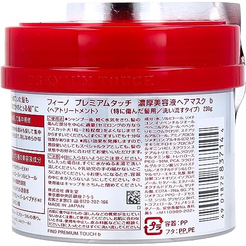 商品説明 商品名 フィーノ プレミアムタッチ 浸透美容液ヘアマスク230g 詳細 美容液成分をギューッと凝縮した、ダメージケア用トリートメントです。 傷みきった毛先まで、しっとりとなめらかでスルスルの指触りに仕上げます。 枝毛・切れ毛でお悩みの方などにオススメです。 洗い流すインバスタイプ。