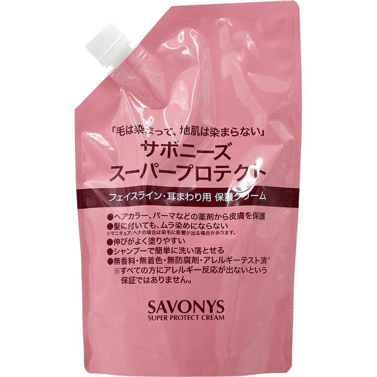 商品情報 販売名 サボニーズ スーパープロテクト(保護クリーム) 内容量 500g業務用 商品説明 フェイスライン・耳まわり用保護クリームヘアカラー、パーマなどの薬剤から皮膚を保護します。毛髪に付着しても、ムラ染めになりません。ご使用方法1、施術前に適量(厚めにしっかり)を、はえ際、耳回り、えり足などに塗布。2、施術後、乳化を行いシャンプーなどで充分に洗い流してください。3、万一、地肌に...