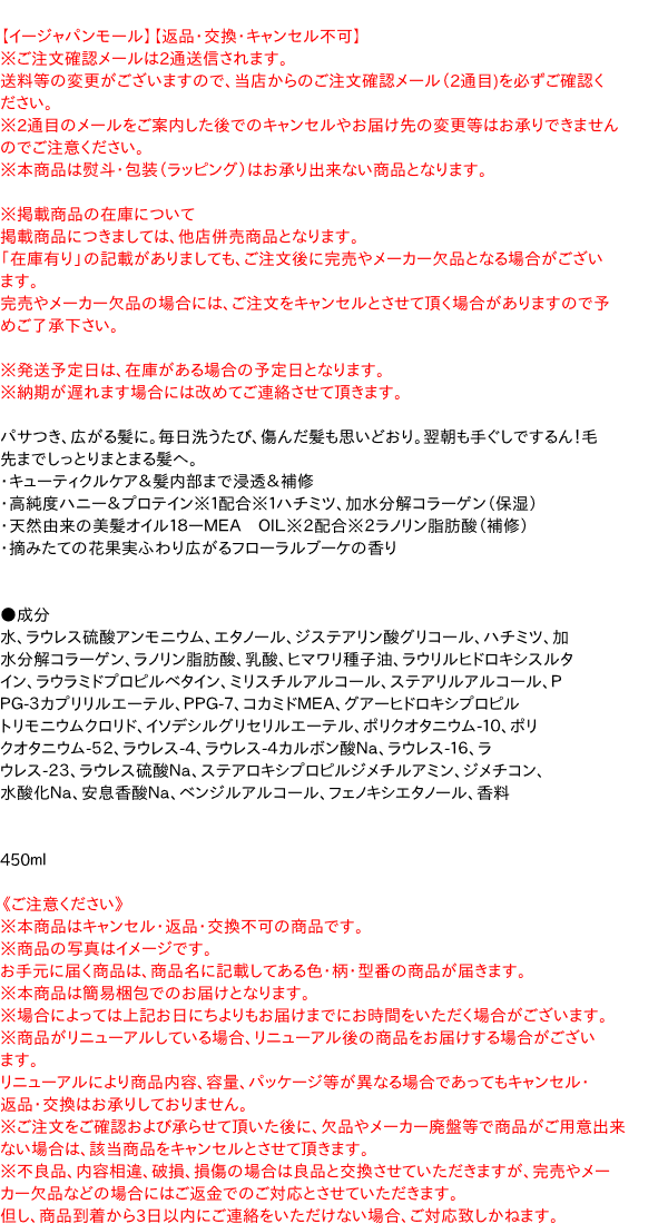 ■製品特徴 ●パサつき、広がる髪に ●毛先までしっとりまとまる髪へ ●毎日洗うたび、傷んだ髪もダメージ補修 ●翌朝も手ぐしでするん!とあつかいやすい ●キューティクルケア&髪内部ケア ●荒れたキューティクル表面もなめらかに補修 ●傷んだ髪内部まで浸透&補修 ●高純度ハニー&プロテイン配合※1 ※1 ハチミツ、加水分解コラーゲン(保湿) ●天然由来の美髪オイル18-MEA OIL※2配合 ※2 ラノ...