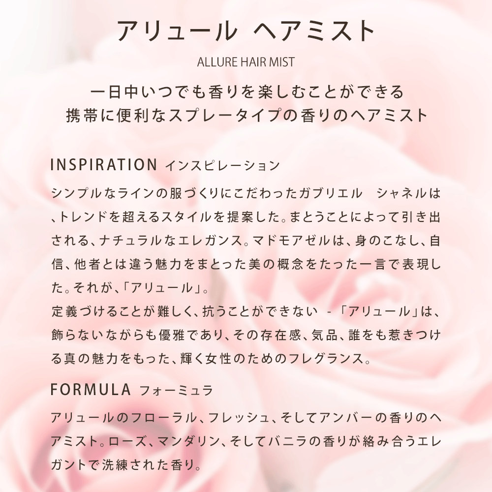 どのアイテムよりも軽やかでフレッシュに、そして繊細にココ マドモアゼルの香りをお楽しみいただけるココ マドモアゼル ヘア パルファム