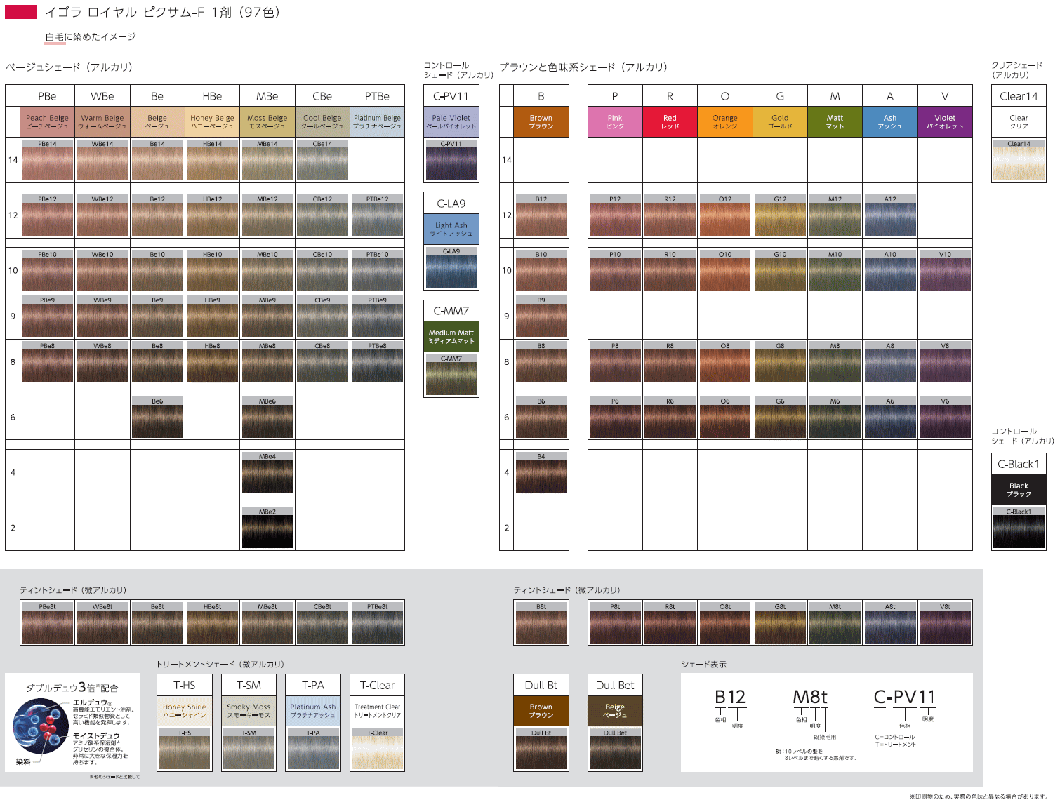 ※カラーチャートよりお色をお選びいただき、上記の各カラーごとのメニューよりご選択ください。 IGORA ROYAL PIXAM-F 瑞々しく彩る、やわらか色。 コンディションの悪い髪でも理想どおりの色と潤いに満ちた質感、やわらかさを実現するファッションカラー。 1.硬く重く見えやすい日本人の髪を、持って生まれたかのような自然なやわらか色に染め上げる『隠しラベンダー処方』と、より透明感のある発色を叶...