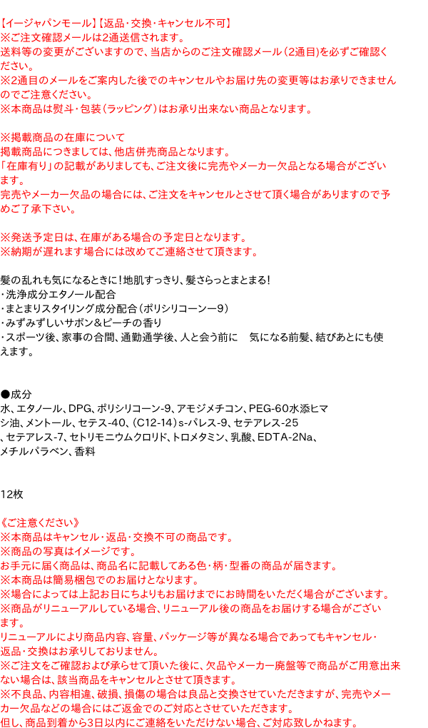 商品情報成分・素材成分:水、エタノール、DPG、ポリシリコーン-9、アモジメチコン、PEG-60水添ヒマシ油、メントール、セテス-40、(C12-14)s-パレス-9、セテアレス-25、セテアレス-7、セトリモニウムクロリド、トロメタミン、乳酸、EDTA-2Na、メチルパラベン、香料香り・色・味みずみずしいサボン&ピーチの香り使用方法使い方シートを広げて、指先を小刻みに動かして、地肌や髪をふきます...