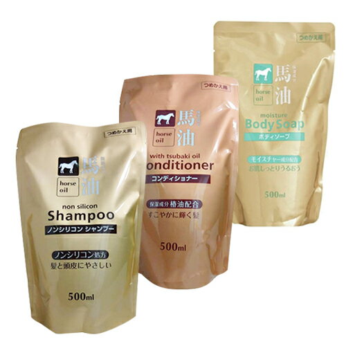 (熊野油脂)馬油シリーズ 詰替え 500mL(シャンプー・コンディショナー・ボディソープより選択) - 馬油成分がお肌に必要なうるおいをしっかり補います。
