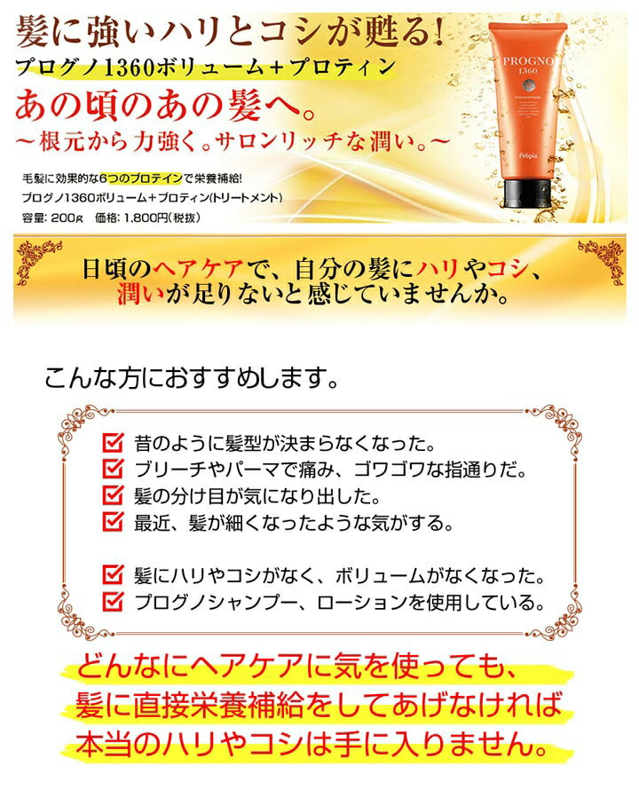 商品名 PROGNOプログノ1360Volume+Protein 2個 成分 水、セタノール、ジメチコン、ベヘントリモニウムクロリド、ステアリルアルコール、グリセリン、オリーブ果実油、コハク酸ビスエトキシジグリコール、BG、加水分解ケラチン(羊毛)、加水分解ハチミツタンパク、加水分解コラーゲン、加水分解シルク、加水分解コンキオリン、ゼイン、パンテノール、ヒマワリ種子ロウ、パーム油、褐藻エキス、ツバ...