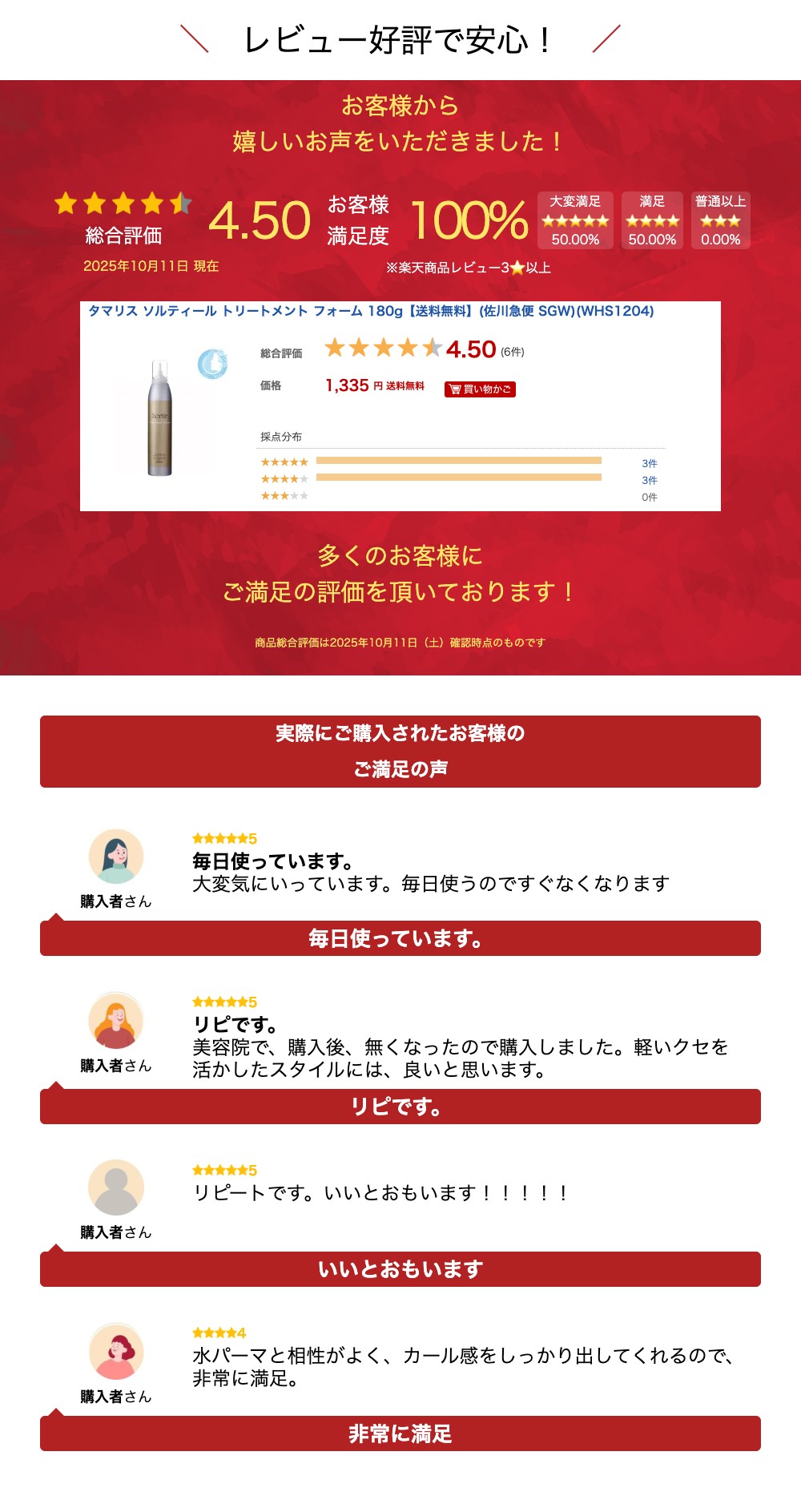 商品詳細 商品名 タマリス ソルティール トリートメント フォーム 180g メーカー タマリス シリーズ ソルティール 内容量 180g 商品説明 ダメージケアしながら、髪にやわらかさとしなやかさをプラスするヘアムース 髪に自然なツヤと、やわらかな質感を与えます。愛おしさ溢れる「フルーティーフローラル」の香り。 使用方法 適量を手のひらに取って、髪になじませてスタイリングしてください。 成分 水...